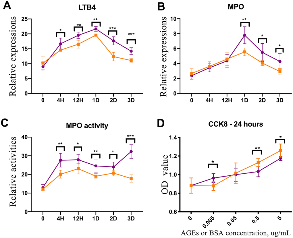 In spite of merits, this study still has some limitations. The in vitro CCK-8 assay was performed on normal cell culture induced neutrophils, thus the effect of hyperglycemia and its co-effect with AGEs on neutrophils still uncovered and need further exploration. In vitro study of μ-Slide chemotaxis experiment illuminated neutrophil migration more visually, while this caused difficulties in analyze. To evaluate the results, we measured the coagulated area dimensions and density of neutrophils next to this area for describing the ability of migration and aggregation of neutrophils. There could be more data translated from this slide like using 3D in-visual photography.