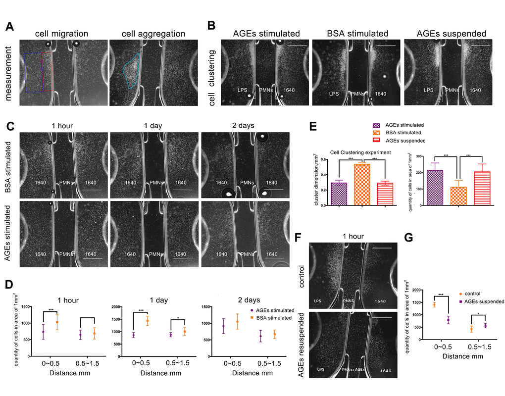 Cell migration (6 replicates) and clustering (3 replicates) abilities were measured using μ-Slide Chemotaxis (ibidi, Germany) according to the manufacturer’s instructions. 6 replicates represented for 6 neutrophil culture plates were used in each group to detect cell migration ability and 3 replicates represented for 3 neutrophil culture plates were used in each group to detect cell clustering ability. Approximately 3×106/mL of neutrophils were used for the migration experiment, and 3×107 /mL of neutrophils were used for clustering experiment. As shown in Figure 5A, 3 chambers were injected with RPIM1640, 1 μg/mL LPS that was diluted in RPIM1640), and neutrophils that were stimulated by AGEs or BSA/suspended in RPIM1640 or AGEs. Slides that were preheated in an incubator at 37° C were then mounted on the microscope stage that was sustained at a temperature of 37° C. The plugs were pulled, and the images were collected after 1 h, 1 d, or 2 d.