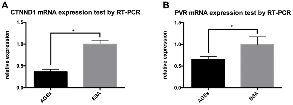 Results from RT-PCR also revealed that the mRNA expressions of CTNND1 and PVR were reduced in neutrophils that were stimulated with AGEs as compared with those in neutrophils that were stimulated with BSA control (Figure 8, P<0.05).