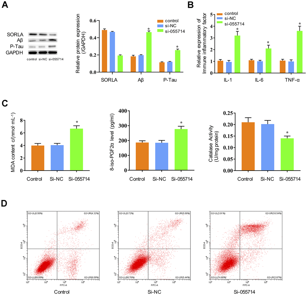 To study the potential functions of NONMMUT055714, we investigated whether its expression impacts inflammatory responses, oxidative stress, and tau phosphorylation in primary hippocampal neurons. Suppression of NONMMUT055714 significantly decreased the expression of SORLA in the si-NONMMUT055714 group of primary hippocampal neurons compared to the control and si-NC groups (p < 0.05) (Figure 2A). The si-055714 group demonstrated significantly increased expression of Aβ and phosphorylated tau protein (Figure 2A) as well as inflammatory markers IL-1, IL-6, and TNF-α (p < 0.05) (Figure 2B). Compared to the control and si-NC groups, the si-055714 group had significantly increased levels of MDA and 8-iso-PGF2α, and a significantly decreased level of CAT (p < 0.05) (Figure 2C). Increased apoptosis was also observed on flow cytometry in si-055714 group relative to the NC group (p < 0.05) (Figure 2D). Taken together, these results indicate that silencing NONMMUT055714 promotes inflammatory responses, oxidative stress, neuronal apoptosis and tau phosphorylation in primary hippocampal neurons.