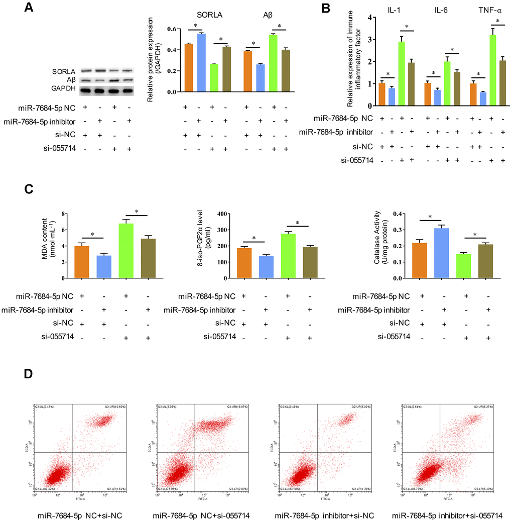 We then investigated the influence of miR-7684-5p downregulation on the role of NONMMUT055714 in POCD. Significantly decreased SORLA expression and increased Aβ expression were observed with silencing of NONMMUT055714 in transfected primary hippocampal neurons in vitro. Silencing of miR-7684-5p reversed these effects, with SORLA and Aβ expression similar to negative controls (p < 0.05) (Figure 4A). The expression of IL-1, IL-6, and TNF-α were significantly increased with si-NONMMUT055714 transfection, while there was a relative decrease in these markers with the addition of miR-7684-5p inhibitor transfection (p < 0.05) (Figure 4B). Silencing of miR-7684-5p also reversed si-NONMMUT055714-induced increases in MDA and 8-iso-PGF2α and decrease of CAT (p < 0.05) (Figure 4C). In flow cytometry, silencing of miR-7684-5p eliminated the effect of si-NONMMUT055714 increasing the rate of apoptosis, with the percentage of apoptotic neurons similar to the negative control group (p < 0.05) (Figure 4D).