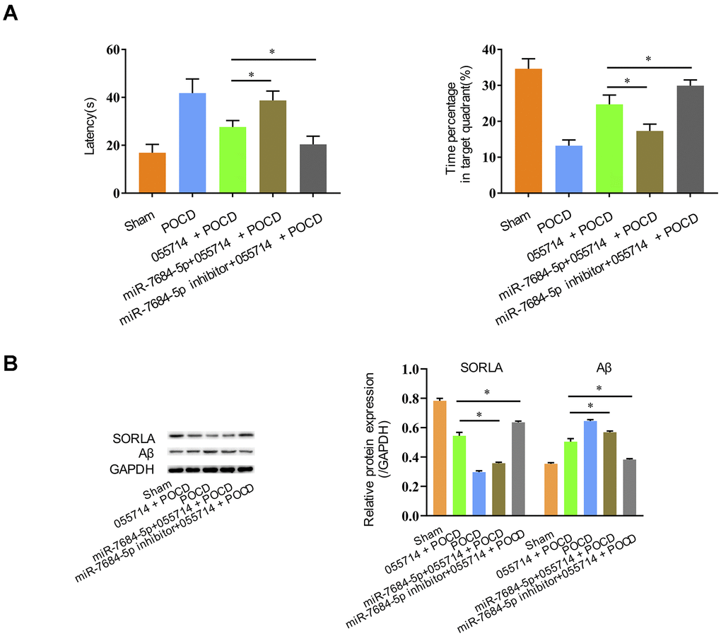 Overexpression of miR-7684-5p decreased SORLA expression and increased Aβ expression in miR-7684-5p + 055714 + POCD mice compared to 055714 + POCD mice, but silencing miR-7684-5p reversed that effect caused by lncRNA NONMMUT055714 (p < 0.05) (Figure 5B).