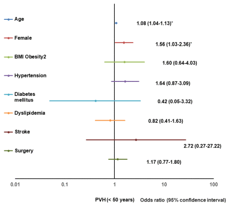 Significant risk factors for a positive change of grade I or higher PVH in participants aged < 50 years were age (1.08, 1.04–1.13) and the female sex (1.56, 1.03–2.36); for participants aged 50-59 years, they were age (1.16, 1.1-1.23) and hypertension (2.11, 1.46-3.05); and for participants aged ≥ 60 years, they included age (1.12, 1.08–1.15) and hypertension (2.23, 1.64–3.04) (Table 3). Figure 2 shows the results of the multivariate logistic regression analysis for a positive change of grade I or higher in PVH for participants aged < 50 years, depicted as forest plots.