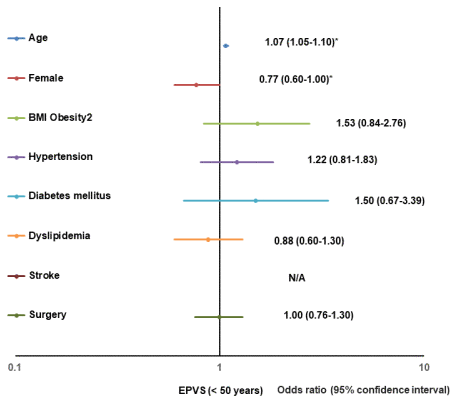 The significant risk factors for positive changes in EPVS in participants aged < 50 years were age (1.07, 1.05–1.10) and the female sex (0.77, 0.60-1.00); for participants aged 50-59 years, it was the female sex (0.66, 0.50-0.87); for participants aged ≥ 60 years, it was hypertension (1.71, 1.25–2.35) (Table 4). Figure 3 shows the results of the multivariate logistic regression analysis for a positive change of grade I or higher in EPVS for participants aged < 50 years, depicted as forest plots.