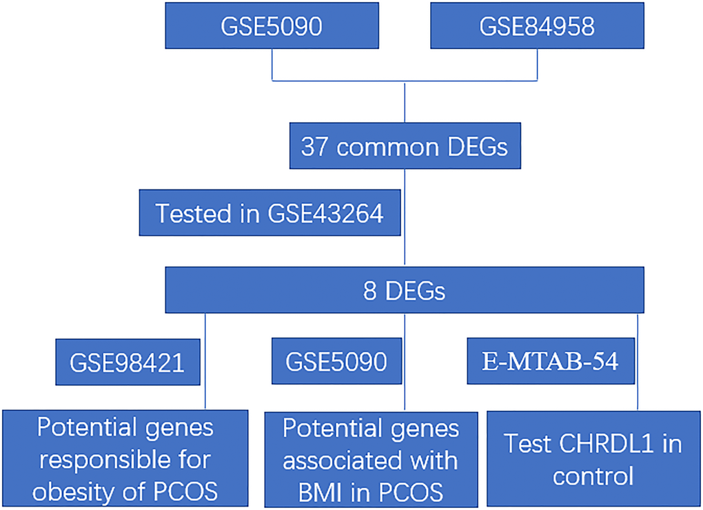 The original datasets comparing the gene expression profiles of the adipose tissues between PCOS patients and normal controls were downloaded from NCBI GEO databases and ArrayExpress databases (Table 1). The accession number was GSE5090 [13], GSE98421 (https://www.ncbi.nlm.nih.gov/geo/query/acc.cgi?acc=GSE98421), GSE43264 (https://www.ncbi.nlm.nih.gov/geo/query/acc.cgi?acc=GSE43264), GSE84958 [14], E-MTAB-3768 (https://www.ebi.ac.uk/arrayexpress/experiments/E-MTAB-3768/), and E-MTAB-54 (https://www.ebi.ac.uk/arrayexpress/experiments/E-MTAB-54/) respectively. The microarray data of GSE5090 was based on GPL96 ([HG-U133A] Affymetrix Human Genome U133A Array), GSE98421 and E-MTAB-54 were based on GPL570 (Affymetrix Human Genome U133 Plus 2.0 Array), GSE43264 was based on GPL15362 (NuGO array (human) NuGO_Hs1a520180), GSE84958 was based on GPL16791 (Illumina HiSeq 2500), and E-MTAB-3768 was based on A-MEXP-2072 (Illumina HumanHT-12_V4). The clinic information of the E-MTAB-3768 dataset was also downloaded, especially the BMI index. The analytic workflow was shown in Figure 1.