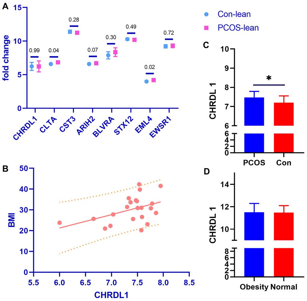 Though obesity is a common characteristic of PCOS, lean patients are not rare in the clinic. We then explored the main DGEs between obese and lean PCOS patients. First, we explored the expression pattern of the 8 detected DGEs in GSE98421, a dataset based on lean PCOS patients and age & BMI matched healthy controls. Interestingly, only two of them were statistically significant (CLTA, EML4), and the remaining not (CHRDL1, CST3, ARIH2, BLVRA, STX12, EWSR1) (Figure 3A). It seems these 6 genes may be related to the weight of PCOS patients; thus, we use the dataset E-MTAB-3768 to identify if the expression of these genes is connected with the BMI index. Among the 6 genes, only the expression of gene CHRDL1 was found to be in linear regression with the BMI index in PCOS patients (p = 0.0358, Y = 6.460*X - 17.51) (Figure 3B), but such difference was not found in the healthy controls (p = 0.2487). Similarly, the express ion of CHRDL 1 was significantly higher in obesity PCOS cases than the BMI matched healthy controls (p = 0.0415, Figure 3C). Moreover, when only considering the obesity status but regardless of the PCOS, there was no statistical difference of CHRDL 1 expression between the obesity and normal cases, as based on the analysis of the dataset E-MTAB-54 (p = 0.8816, Figure 3D).