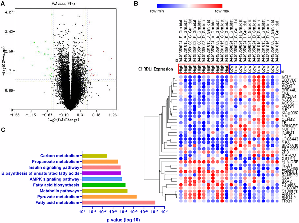 To further investigate the biological role of CHRDL1 in PCOS, gene expression profiles associated with CHRDL1 were derived based on genome-wide microarray analysis of E-MTAB-3768. The PCOS patients were divided into 2 groups according to the expression level of CHRDL1, and 29 up-regulated and 16 down-regulated genes were identified as significantly associated with CHRDL1 expression between the groups (FDR-adjusted P < 0.05 and |logFC| > 0.5, Figure 4A). Further, these aberrant genes were presented as an expression heatmap (Figure 4B). These dysregulated genes were mainly involved in metabolism pathways as shown by KEGG analysis, including fatty acid metabolism, pyruvate metabolism, metabolic pathways, fatty acid biosynthesis, AMPK signalling pathway, biosynthesis of unsaturated fatty acids, insulin signaling pathway, propanoate metabolism, and others, (Figure 4C), indicating the potential role of CHRDL1 in regulating metabolism status in PCOS patients.