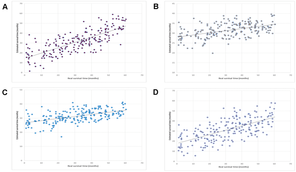 We compared this OV-SURV method with standard multiple linear regression [36], LASSO [37], and Elastic net [38]. The LASSO method resulted in a correlation coefficient and a mean absolute error of 0.48 and 1.00 years, respectively. The Elastic net method resulted in a correlation coefficient and a mean absolute error of 0.55 and 1.00 years, respectively. The multiple linear regression method resulted in a correlation coefficient and a mean absolute error of 0.66 and 0.84 years, respectively. A comparison of these results is shown in Table 1. The correlation plots between the estimated and real survival time obtained using OV-SURV, LASSO, Elastic net, and multiple linear regression are shown in Figure 2.