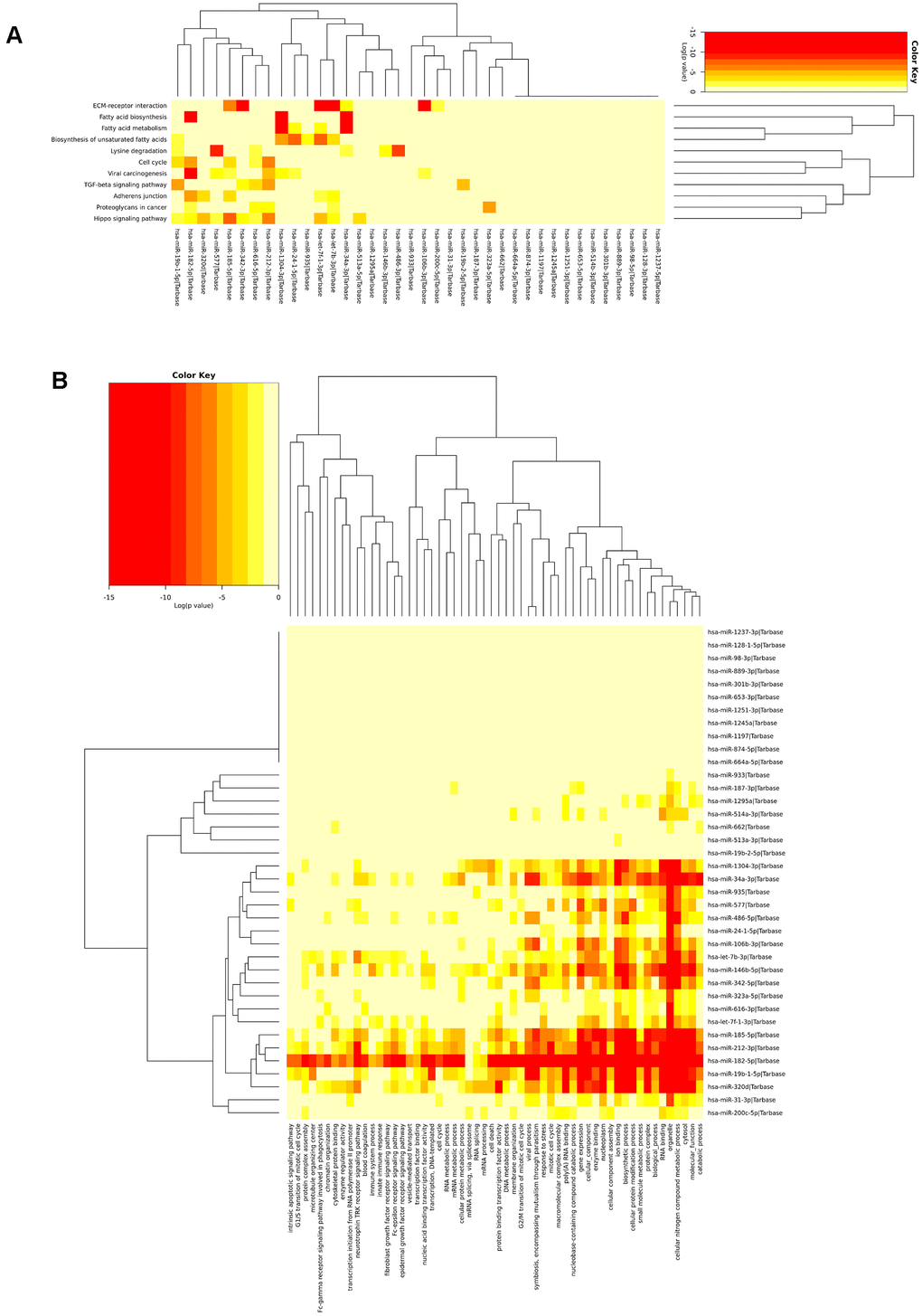 Additionally, the KEGG analysis of all 39 miRNAs in the signature revealed that few miRNAs were highly enriched in fatty acid biosynthesis, fatty acid metabolism, ECM/receptor interactions, and the hippo signalling pathway. The most highly significant pathway found in the KEGG pathway analysis was fatty acid biosynthesis (p<1E-325). There were four miRNAs (hsa-miR-182, hsa-miR-34a, hsa-miR-342, and hsa-miR-1304) that were highly enriched in fatty acid biosynthesis (hsa00061) and targeted genes such as FASN, ACSL4, and ACACA. Additionally, five miRNAs, namely, hsa-let-7f, hsa-miR-34a, hsa-miR-342, hsa-miR-1304, and hsa-miR-24, targeted the genes FASN, PTPLB, SCD, ACSL4, ECHS1, and TECR, which were all involved in fatty acid metabolism (p=1.02E-14). Fatty acid synthase (FAS) is an enzyme responsible for the synthesis of fatty acids and has been identified in most human carcinomas. FAS protein expression is associated with poor prognosis in both prostate and breast cancers [40, 41]. An in vivo microarray study revealed that there was a significant relationship between phosphorylated AKT and the expression of FAS; inhibition of FAS activity resulted in down regulation of phosphorylated AKT, which initiates apoptosis in ovarian cancer cells [42]. Inhibition of FAS and activation of AMP-activated protein kinase is selectively cytotoxic to SKOV3 human ovarian cancer cells [43]. Additionally, inhibition of FAS is significantly associated with survival in xenograft models [44]. This analysis suggested that the selected miRNAs were relevant to cancer and related biological signalling pathways. The heatmap showing KEGG pathway enrichment analysis of the miRNA signature is shown in Figure 3A.