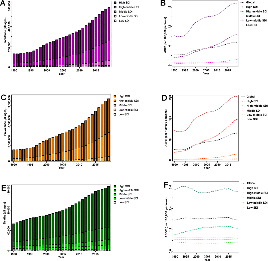 The sociodemographic index (SDI), a metric for measuring development, which actually captures three different but important aspects of each country and region—income, education, and fertility—allows for the comparison of health outcomes among countries and the performance of health systems, to better understand what the health landscape would look like in the future [45]. According to SDI value, countries are divided into five quintiles: high (>0.81), high–middle (0.69–0.81), middle (0.61–0.69), low–middle (0.46–0.61), and low SDI (<0.46).