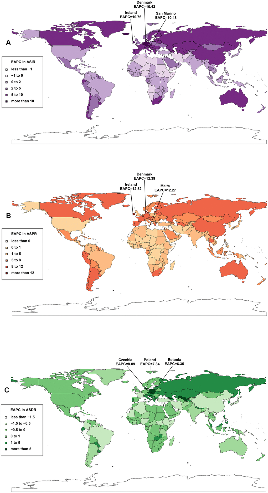 The incidence of CAVD varied significantly from nation to nation. In 2019, the highest number of incident cases (117,080) was recorded in the United States, followed by Japan (71,837), China (54,965), and the Russian Federation (54,152) (Supplementary Tables 1, 2 and Supplementary Figure 1). Moreover, Slovenia, Hungary, and Romania had the highest ASIR, with 62.21/100,000 persons, 56.24/100,000 persons, and 54.92/100,000 persons, respectively (Supplementary Table 1 and Supplementary Figure 2). As for trends, Ireland and Andorra had the largest growth in ASIR (EAPC=10.76, 95% CI: 2.16–20.08) and cases (42.61-fold increase), respectively (Supplementary Table 1, Figure 3A and Supplementary Figure 3).
