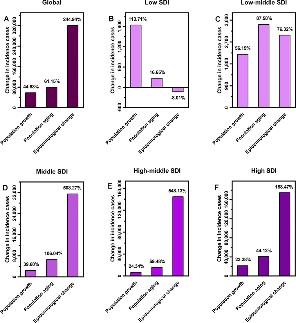 Around the globe, the number of incident cases of CAVD increased from 130,822 in 1990 to 589,638 in 2019. According to decomposition analysis, population growth and population aging, and epidemiological changes accounted for 44.63%, 61.15%, and 244.94%, respectively. As for SDI regions, population growth accounted for 113.71%, 56.16%, 39.60%, 24.34%, and 23.28% of the changes of CAVD incident cases in low, low–middle, middle, high–middle, and high SDI quintiles, respectively. These proportions for population aging were 16.65%, 87.58%, 106.04%, 59.48%, and 44.12% in the five SDI quintiles, respectively. Furthermore, epidemiological changes accounted for −8.01%, −76.32%, 508.27%, 548.13%, and 188.47% in all SDI quintiles, respectively (Figure 4).