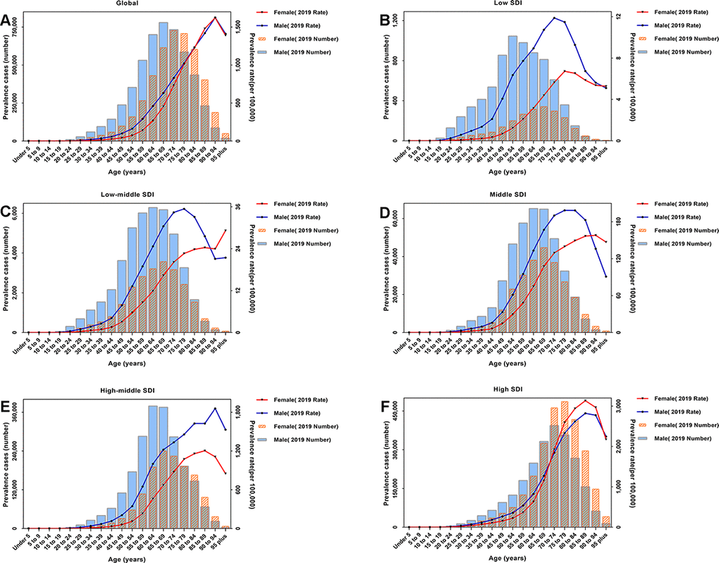 Moreover, to explore the distribution of sex and age regarding CAVD prevalence, we obtained the crude number and rates of prevalence, to analyze the sex–age patterns for male and female individuals in 2019, according to the 20 age groups listed below: under 5, 5–9, 10–14, 15–19, 20–24, 25–29, 30–34, 35–39, 40–44, 45–49, 50–54, 55–59, 60–64, 65–69, 70–74, 75–79, 80–84, 85–89, 90–94, and 95 years and over.