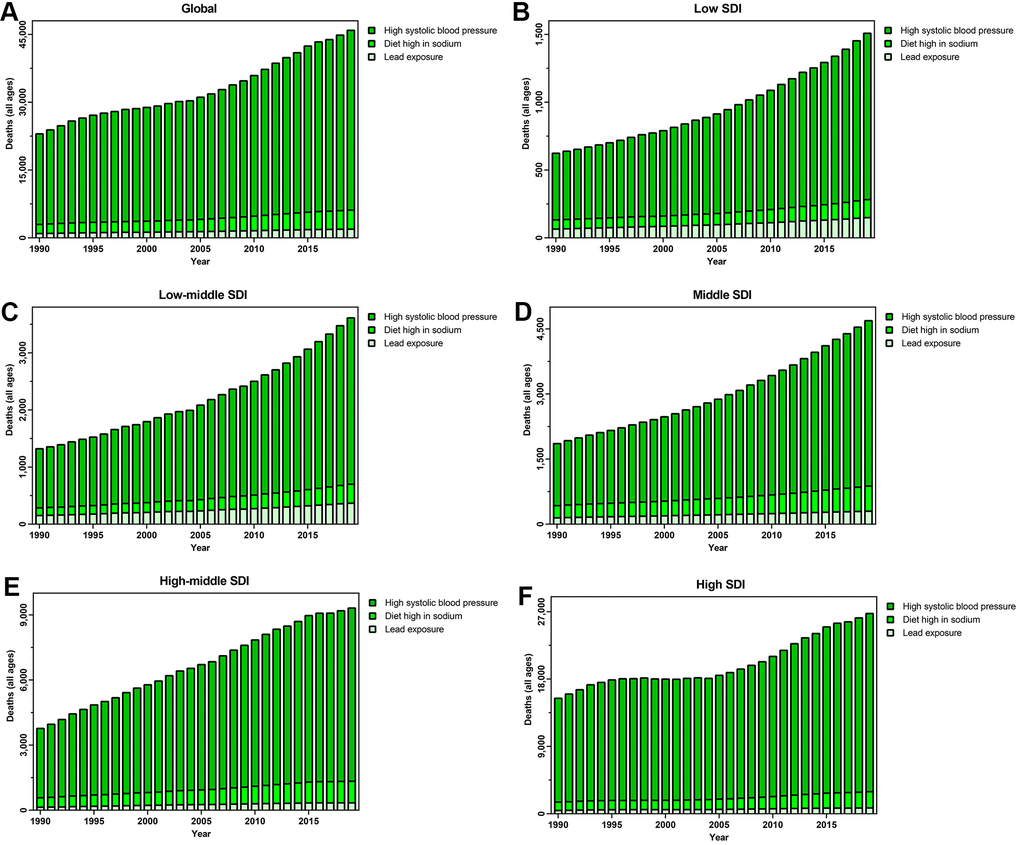 On the basis of GBD research, CAVD deaths were mainly attributable to high SBP, diet high in sodium, and lead exposure. Worldwide, high SBP (the leading risk factor) led to 39,749 CAVD deaths in 2019. For SDI regions, deaths associated with this factor increased from 1,226 in low quintiles to 23,803 in high SDI quintiles. A high-sodium diet led to 4,227 global CAVD deaths in 2019, presenting an upward trend across all five SDI quintiles over the past three decades. Lead exposure resulted in 1,925 global CAVD deaths in 2019, an increase of 105.23% from 938 in 1990. Between 1990 and 2019, the change in deaths owing to lead exposure decreased from 148.88% in high-middle quintiles to 75.40% in high SDI quintiles (Figure 6).