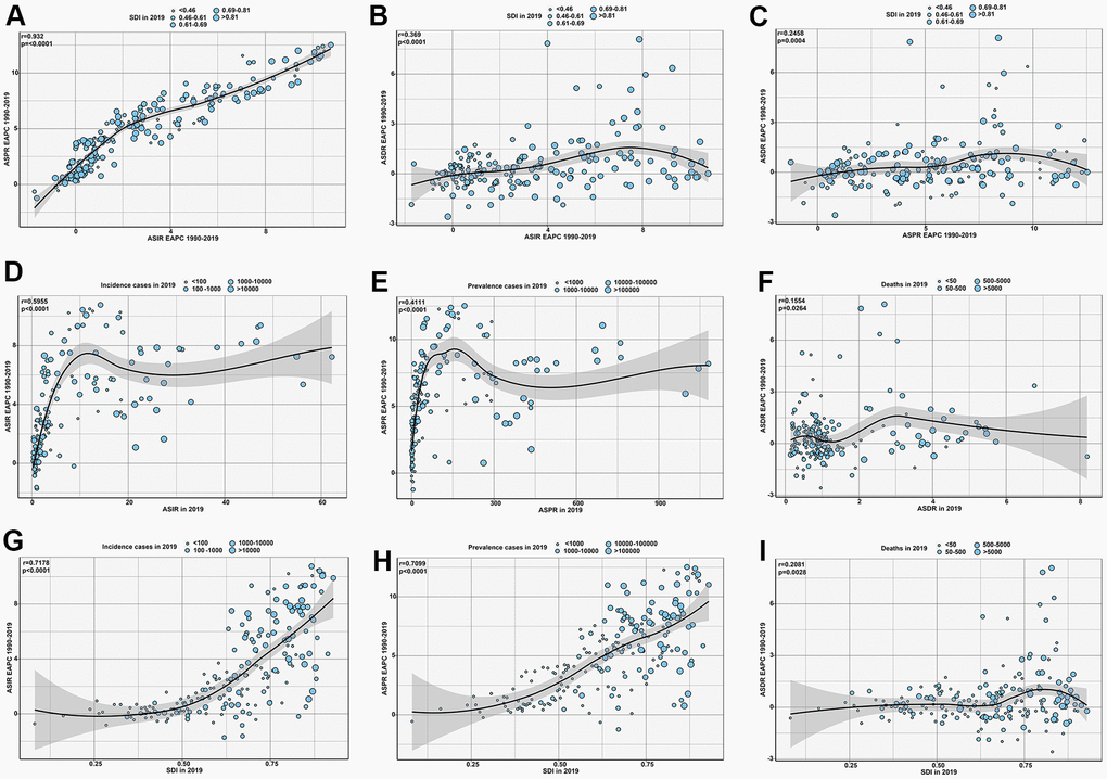 As shown in Figure 7, the EAPC in the ASIR showed an important correlation with the ASPR EAPC (r=0.932, p<0.0001) and ASDR EAPC (r=0.369, p<0.0001). Additionally, the ASIR EAPC was significantly related to the ASIR (r=0.5955, p<0.0001) and SDI (r=0.7178, p<0.0001) in 2019. Similarly, the ASPR EAPC was significantly associated with the ASPR (r=0.4111, p<0.0001) and SDI (r=0.7099, p<0.0001) in 2019 (Supplementary Figure 10). However, the ASDR EAPC had no significant correlation with the ASDR or SDI for all 204 countries in 2019.