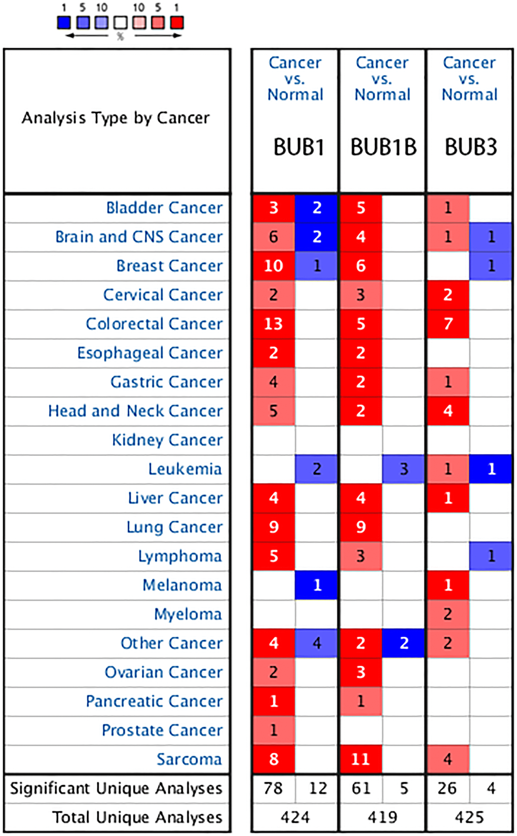 Three BUB family members have been identified in patients with different types of sarcoma: BUB1, BUB1B and BUB3. They are overexpressed in all samples of sarcoma compared to normal tissue. The transcriptional levels of BUBs were compared between sarcoma and normal samples using Oncomine databases (Figure 1). The mRNA levels of these BUBs were significantly upregulated in patients with sarcoma in two datasets.