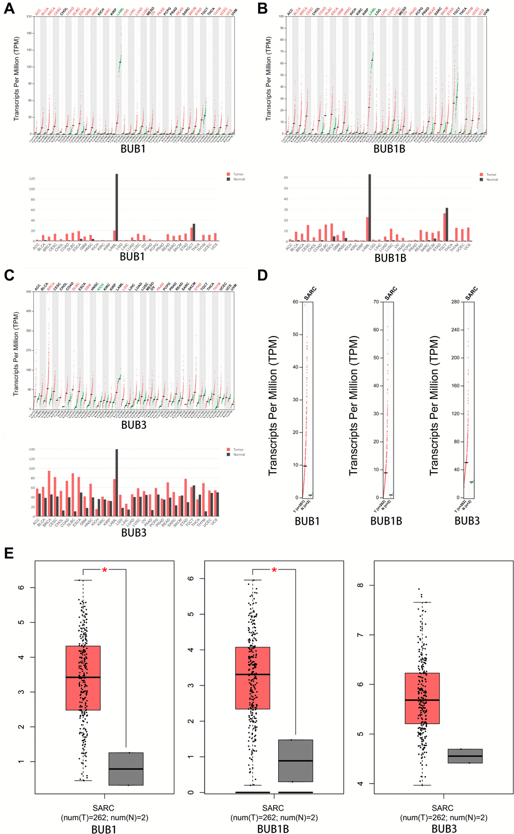 The expression patterns of BUBs in sarcoma samples were further compared to normal tissue using the GEPIA database. Notably, the expressions of BUB1 and BUB1B are significantly higher in sarcomas compared to normal tissues (Figure 2A–2E). The overexpression of BUB3 does not reach significance, possibly due to the low number of patients in the control group.