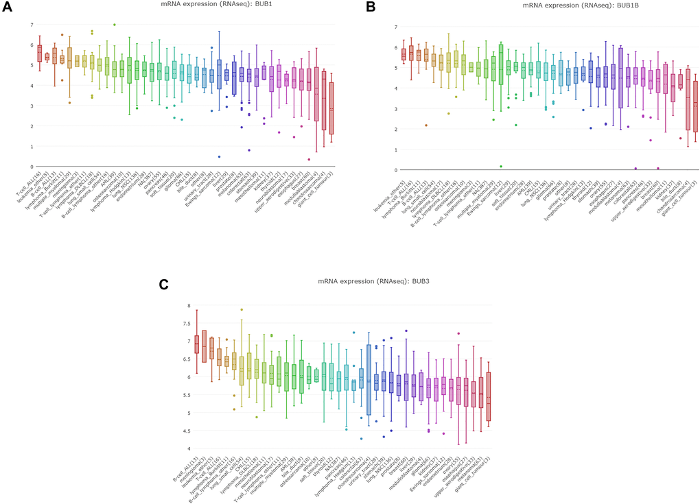 To further explore the expression level of BUBs in sarcoma cell lines, we queried the CCLE database. The expressions of BUB1, BUB1B and BUB3 were highly upregulated (Figure 3) compared to normal control cell lines.