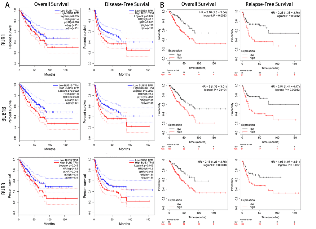 Dysregulation in BUB genes have been reported in many cancers [6, 14–19, 21, 23, 24]. However, the role that BUB factors play in sarcoma remains poorly understood. The present study was the first to explore the expression patterns of BUBs in sarcoma, while investigating its prognostic value and clinical relevance.