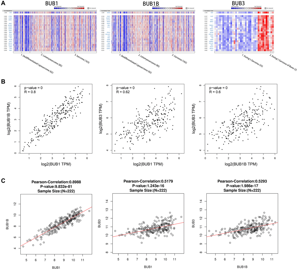 Genes co-expressed with BUBs in sarcoma were analyzed using the Oncomine database. In the Chibon Sarcoma datasets [22], we found BUB1 expression level was positively correlated with levels of CCNB1, AURKA, UBE2C, DLGAP5, NCAPG, CENPA, BIRC5, KIF4A, CCNB2, TPX2, KIF18B, KIF2C, CDC20, CDCA5, CENPE, CKS2, and MELK. For BUB1B, its expression level was positively correlated with levels of CACS5, NUSAP1, KIF20A, TOP2A, PRC1, KIF14, PTTG1, RACGAP1, CKS2, MELK, CENPE, CDCA5, BUB1, CCNB1, and AURKA. In the Schaefer Sarcoma dataset, we found that BUB3 expression level was positively correlated with levels of DLAT, PRPS1, MRPS7, TIMM23, PPIF, MAPK1, TFDP1, NUP98, ATP6V1A, MED6, CAPRIN1, CYP51P2, TMX1, EXOC5, MAT2A, and ACLY (Figure 5A). The association between BUB1, BUB1B, and BUB3 was analyzed using the GEPIA (Figure 5B) and Linked Omics databases (Figure 5C). The correlation coefficients of BUB1 and BUB1B were 0.8 (GEPIA) and 0.8988 (Linked Omics). For BUB1 and BUB3, they were 0.62 (GEPIA) and 0.5179 (Linked Omics). For BUB1B and BUB3, they were 0.6 (GEPIA) and 0.5293 (Linked Omics). All correlations were found to be statistically significant.