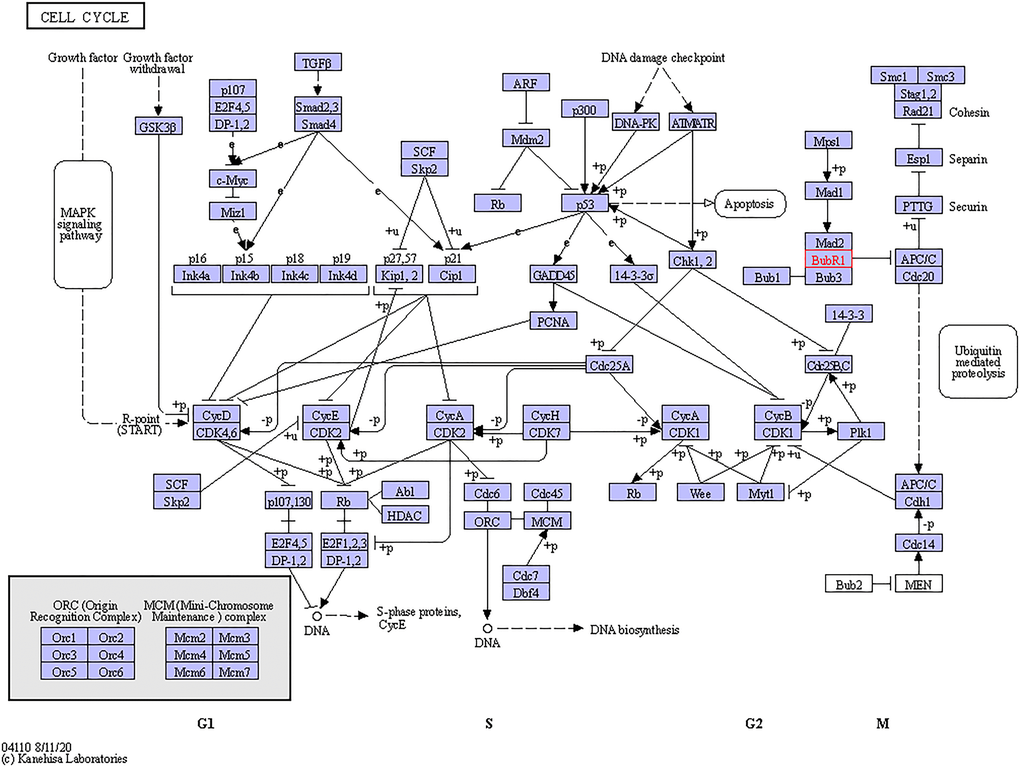 The functional roles of BUBs were evaluated from three perspectives: biological processes, molecular functions, and cellular components. We found that BUBs are involved in the biological processes of meiotic sister chromatid cohesion, meiotic cell cycle, cell division, cellular protein metabolic process, anaphase-promoting complex-dependent catabolic process, cell population proliferation, mitotic spindle assembly checkpoint, apoptotic process, protein phosphorylation, sister chromatid segregation, and nuclear division. Regarding molecular function, protein serine/threonine kinase activity was found to be significantly controlled by BUBs. Cellular components including protein-containing complex, nuclear lumen, cytosol, condensed, chromosome outer kinetochore, condensed nuclear chromosome kinetochore were all found to be associated with the function of BUBs. KEGG pathways analysis showed that BUBs are involved in Human T-lymphotropic virus 1 infection and cell cycle pathways (Table 2 and Figure 6).