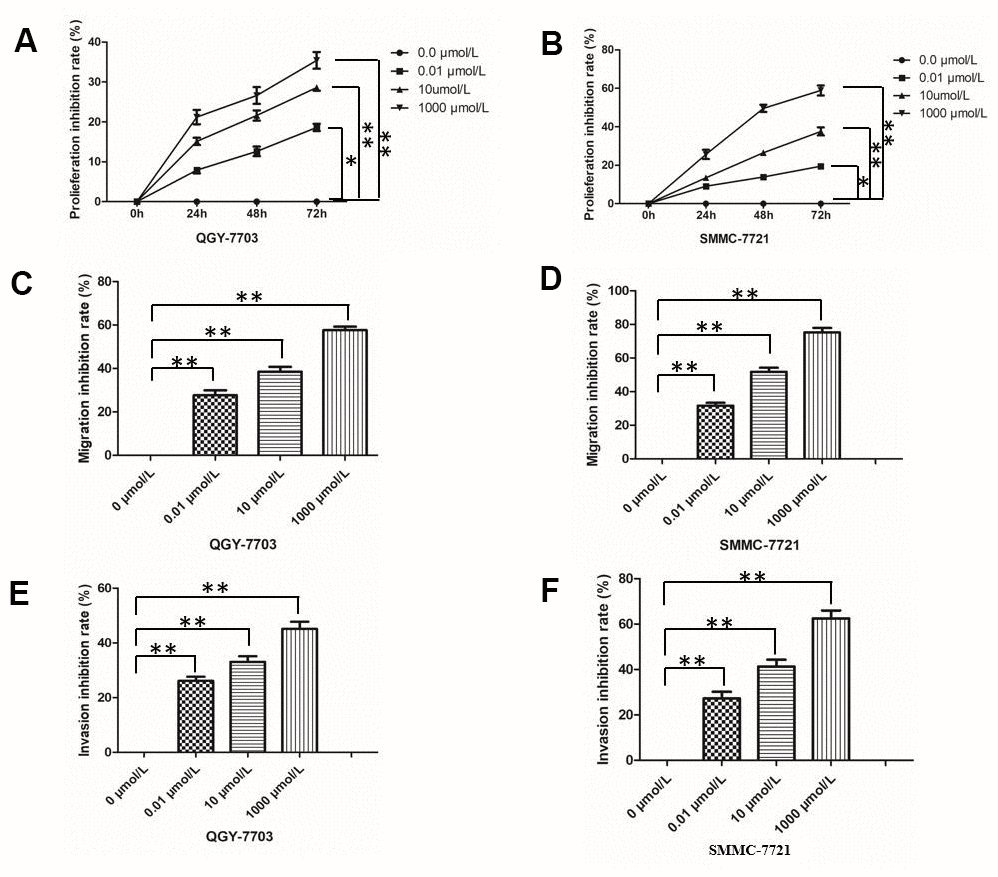 Morphine inhibited growth of the two HCC cell lines QGY-7703 and SMMC-7721 in a dose- and time-dependent manner (Figure 1). At the lowest concentration of 0.01 μmol/L, morphine inhibited growth by 18% (P < 0.05), which rose to 40% at the highest concentration of 1000 μmol/L (P < 0.05). Morphine also significantly suppressed migration and invasion of both HCC cell lines (Figure 1).