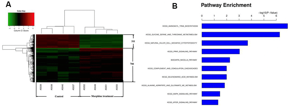 To begin to clarify how morphine may inhibit HCC cell growth, we compared the transcriptome of QGY-7703 cells before and after treatment with morphine using a GeneChip array. We identified 766 genes up-regulated and 311 genes down-regulated by morphine. Pathway enrichment analysis suggested that genes differentially expressed after morphine treatment were involved mainly in aminoacyl-tRNA biosynthesis; glycine, serine and threonine metabolism; natural killer cell-mediated cytotoxicity; and MAPK signaling (Figure 2).