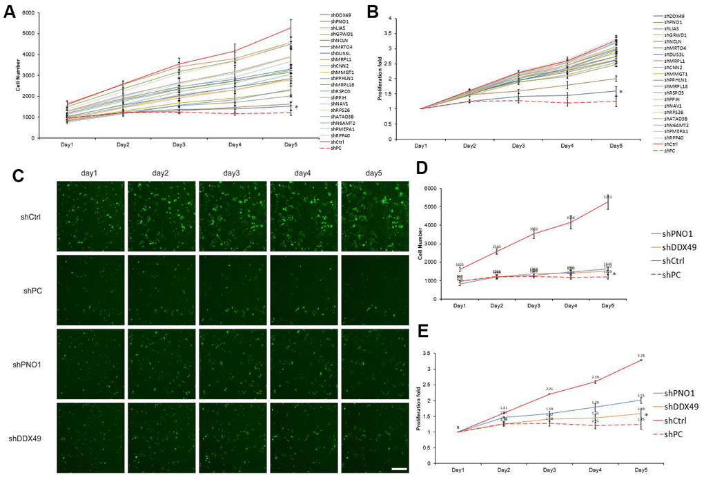 Efficiency of transfection was measured under a fluorescent microscope based on expression of GFP encoded in the lentiviral plasmids. Transfected cells were seeded into 96-well plate at a density of 2000 cells/well (100 μl per well) and incubated for 24 h at 37° C. The Celigo system (Nexcelom, Lawrence, USA) was then used to assay proliferation in each well every day for 5 days.