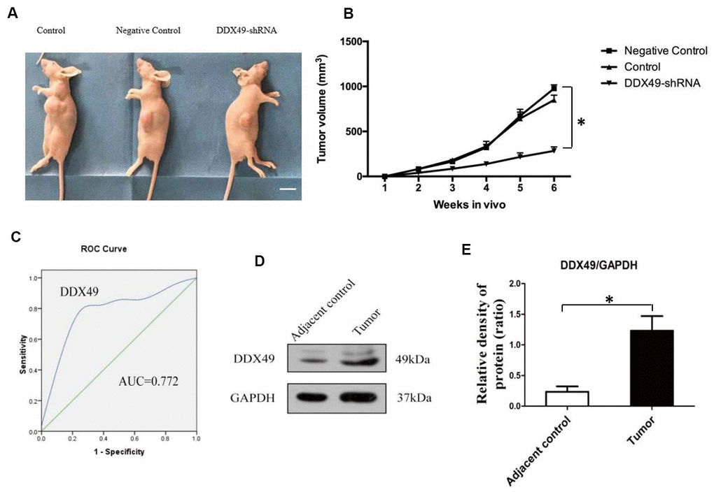 QGY-7703 cells were transfected with DDX49-shRNA or negative-control shRNA (control) and injected into nude mice. Analysis of tumor size after 6 weeks showed that knocking down DDX49 led to significantly smaller tumors (Figure 4A, P < 0.05).