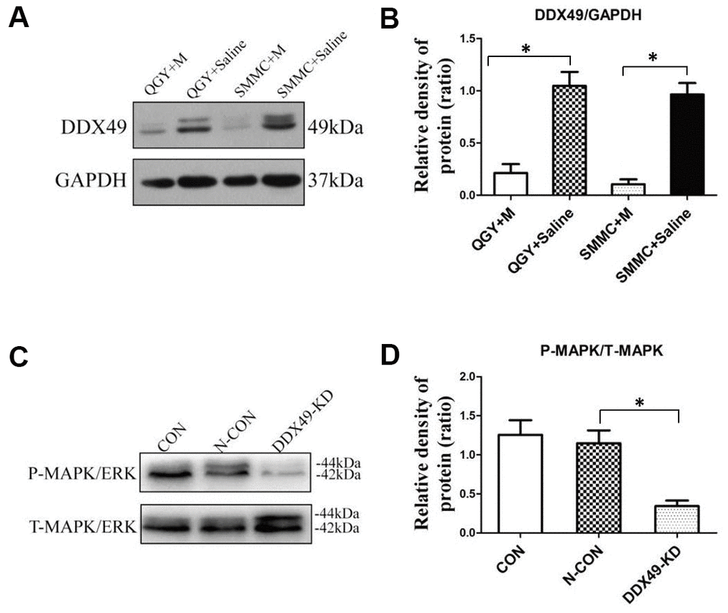 MAPK signaling pathways often play a role in oncogenesis [9], and we found that genes differentially expressed in QGY-7703 cells after morphine treatment were enriched in the KEGG pathway of MAPK signaling. Both of MAPK and DDX49 are located in nucleus, so whether DDX49 have an impact on MAPK raised our interesting. Indeed, we found that knocking down DDX49 led to lower levels of phosphorylated MAPK (Figure 5C), which correlates with less MAPK-mediated signaling [9].