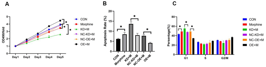 The liver cancer cell lines QGY-7703 and SMMC-7721 were obtained from the Cell Bank at the Shanghai Institutes for Biological Sciences of the Chinese Academy of Sciences (Shanghai, China). The cells were maintained in RPMI-1640 medium (Gibco, Carlsbad, CA, USA) supplemented with 10% fetal bovine serum (Gibco, Carlsbad, CA, USA), penicillin (100 U/ml), and streptomycin (100 μg/ml) at 37° C in a humidified chamber under 5% CO2. Morphine hydrochloride was obtained from Humanwell Healthcare Group (Jiangsu, China).