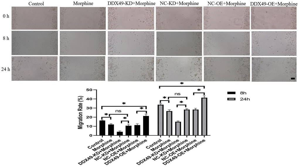 Our data showed that DDX49 has a direct regulation on cell proliferation. This prompted us to investigate whether DDX49 has a regulation role in cancer metastasis. We subsequently investigated the migration and invasion of QGY-7703 cells following the DDX49 deletion or overexpression and then treat with morphine for 48h. We found that DDX49 deletion decreased cells migration (Figure 8) and invasion (Figure 9). Overexpressing DDX49 reversed the cells migration (Figure 8) inhibition effect of morphine, and analogical results can be observed in invasion assay (Figure 9). These data suggested that DDX49 may increase the capacity of migration and invasion in HCC cells.