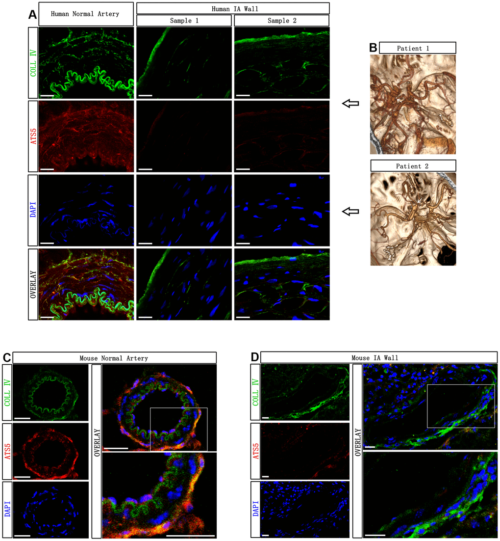First, we investigated the presence of ADAMTS-5 in the aneurysmal arteries of human tissue and compared them with normal cerebral arteries by immunostaining. The CTA imaging data of the two patients who provided human IA samples in the study are shown in Figure 1B. Human IA sample 1 and sample 2 were obtained from IA patient 1 and patient 2, respectively. Extensive ADAMTS-5-positive immunostaining was revealed in the major parts of the media and intima/adventitia for normal cerebral arteries, with only slight ADAMTS-5-positive staining in the luminal part of the intima of IA arteries (Figure 1A). To further verify the decrease in ADAMTS-5 in IA arteries, IA samples obtained from mouse models were used. Immunostainings performed from IA mice samples also revealed the reduction of ADAMTS-5 within the arterial wall of IA arteries (Figure 1C, 1D).