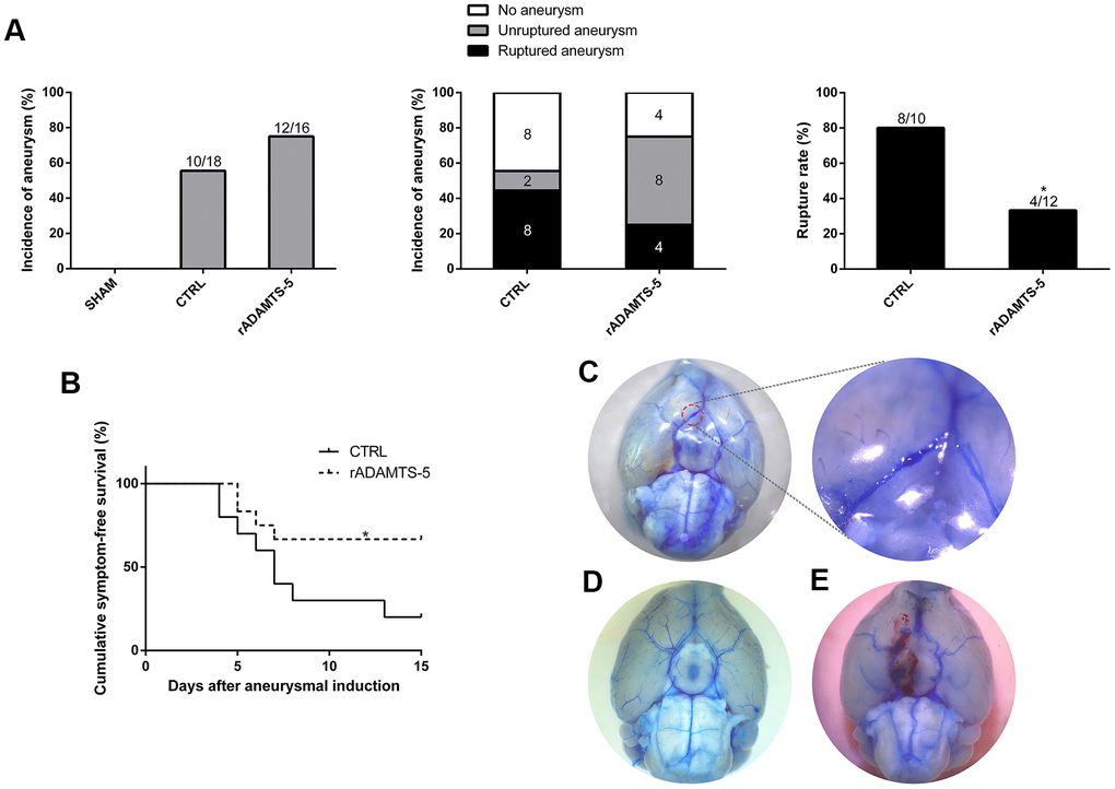 Given the obvious reduction in the cerebral arterial ADAMTS-5 expression observed in human IA and mouse IA, we sought to determine whether ADAMTS-5 played a protective role against IA development using the approach that giving a consecutive number of days of intraperitoneal injections of recombinant ADAMTS-5 protein (rADAMTS-5) in mice that received IA induction. Until the end of the 15-day experiment, no significant difference was found in the overall incidence of aneurysms between the control (CTRL) and rADAMTS-5 treatment group (55.56% versus 75%; n=18 versus n=16; Figure 2A). Nevertheless, rADAMTS-5 treatment significantly reduced the aneurysm rupture rate (Figure 2A; control versus rADAMTS-5: 80% versus 33.33%; P<0.05). The mouse group treated with rADAMTS-5 showed significantly better symptom-free survival than the control group (Figure 2B; Kaplan-Meier log-rank P<0.05). Figure 2D shows normal cerebral arteries, Figure 2C shows an unruptured aneurysm from a mouse without symptomatic signs throughout the experimental period, and Figure 2E shows a ruptured aneurysm with subarachnoid hemorrhage from a mouse that exhibited symptoms of aneurysmal rupture at day 7 after aneurysm induction. Additionally, the blood pressure was monitored before aneurysm induction surgery and every 5 days until day 15 of the study. No significant difference was found in the blood pressure between the control and treatment groups at any time point (Supplementary Figure 2 in the Supplementary Materials). The animal experimental procedure is shown in Supplementary Figure 1 (Supplementary Materials).