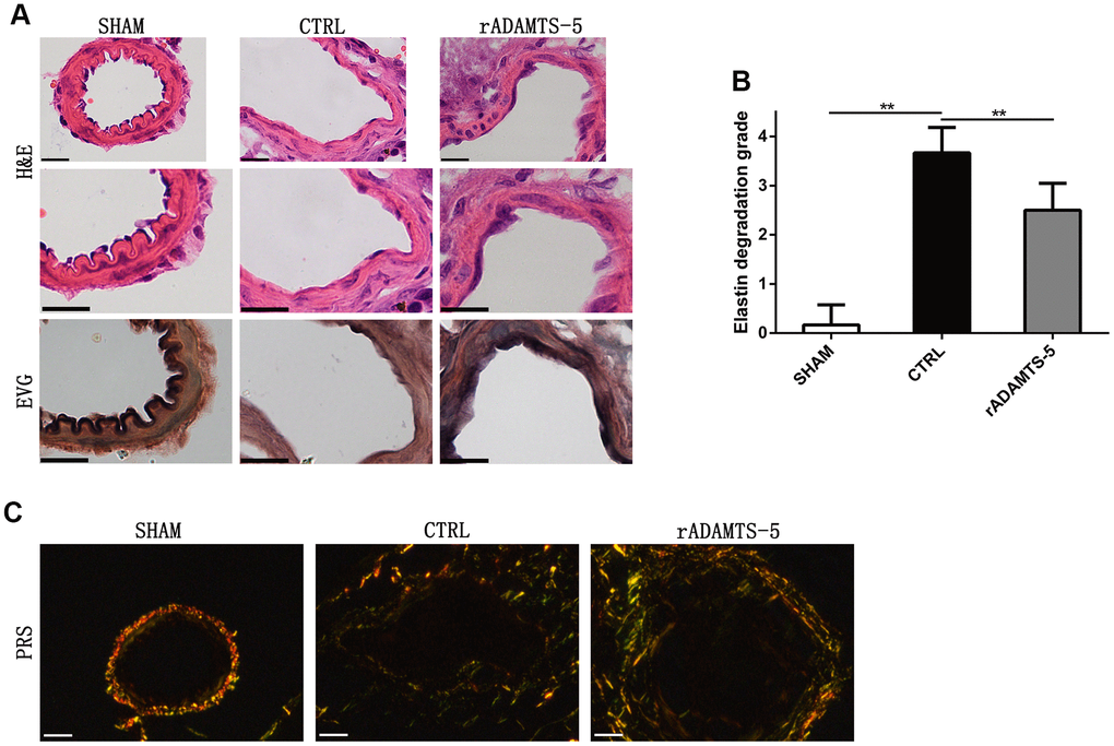 After determining of the protective effect of rADAMTS-5 administration in the IA mouse model, we examined the role of ADAMTS-5 in protecting against arterial ECM degradation. As expected, hematoxylin and eosin staining showed conspicuous thickening of the arterial wall with massive matrix degradation and remodeling in elastase-induced IA mice (Figure 3A). Mice administered rADAMTS-5 showed reduced adventitial atrophy and less lamellar fragmentation than control IA mice (Figure 3A). Next, elastin Verhoeff-van Gieson (EVG) staining was performed to characterize the elastin integrity of IA arteries. The staining demonstrated extensive elastin degradation within the aneurysmal wall of elastase-induced IA mice compared with intact elastin found in sham mice. However, the group of mice that received rADAMTS-5 exhibited a decreased tendency of elastin degradation (Figure 3A). Semiquantitative measurements of elastin degradation showed significantly reduced elastin degradation in rADAMTS-5-administered mice compared with control IA mice (Figure 3B). To further assess collagen distribution in IA, we also performed picrosirius red staining (PRS) for collagen within the aneurysmal tissue by polarization microscopy. Polarized light for picrosirius staining analysis confirmed low mural collagen existence localized within the adventitial layer of the aneurysm section acquired from elastase-induced control IA mice. The overall picrosirius red staining area was lower in the control IA arterial wall than in rADAMTS-5-administered mice (Figure 3C).