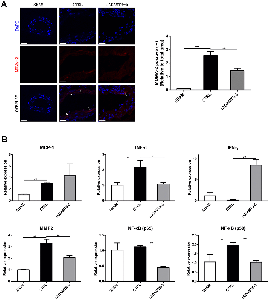 Infiltrating macrophages in the IA wall and alterations in inflammatory mediators are associated with the formation and rupture of aneurysms. And macrophage infiltration is a common phenomenon that exists in aneurysm formation. Thus, the localization of macrophages in mouse IA arterial walls was identified by immunostaining. Sections of aneurysmal arteries of control IA mice showed a significantly higher staining area for macrophages (monocyte and macrophage antibody staining area) than those of mice receiving rADAMTS-5 during the 2 weeks of IA induction (Figure 4A). Thereafter, we assessed the role of ADAMTS-5 in the regulation of specific inflammatory mediators during IA formation and rupture. After aneurysm induction, rADAMTS-5-administered mice showed a significant difference in the expression of multiple inflammatory mediators (tumor necrosis factor-α [TNF-α], matrix metalloproteinase [MMP]-2, interferon-γ [IFN-γ], nuclear factor kappa B [NF-κB]-p65, and nuclear factor kappa B [NF-κB]-p50) when compared with control IA mice (Figure 4B). By contrast, no significant increase was found in the expression of genes encoding the mediator of monocyte chemoattractant protein-1 (MCP-1) (Figure 4B).