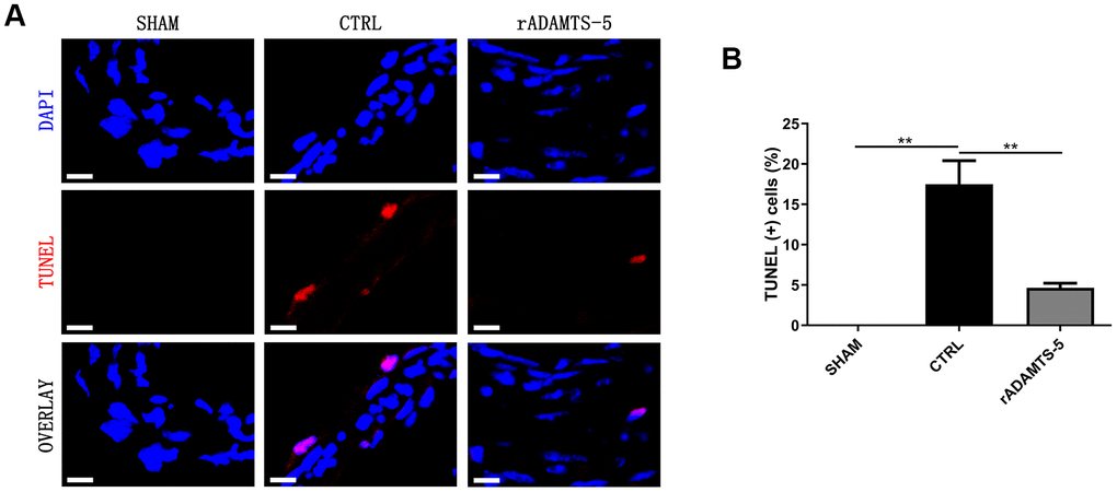 Cell apoptosis of the arterial wall is a significant feature of aneurysmal disease and may contribute to arterial destruction and disease development [9, 10]. Therefore, we examined the role of ADAMTS-5 in arterial cell apoptosis. The in vivo TUNEL assay was performed to evaluate cell apoptosis in the aneurysmal wall. TUNEL-positive cells were abundant in the arterial wall of control IA mice but were significantly reduced in the arterial wall of rADAMTS-5-administered IA mice (Figure 5A, 5B). The finding suggests the potential involvement of ADAMTS-5 in apoptosis during IA development and rupture.