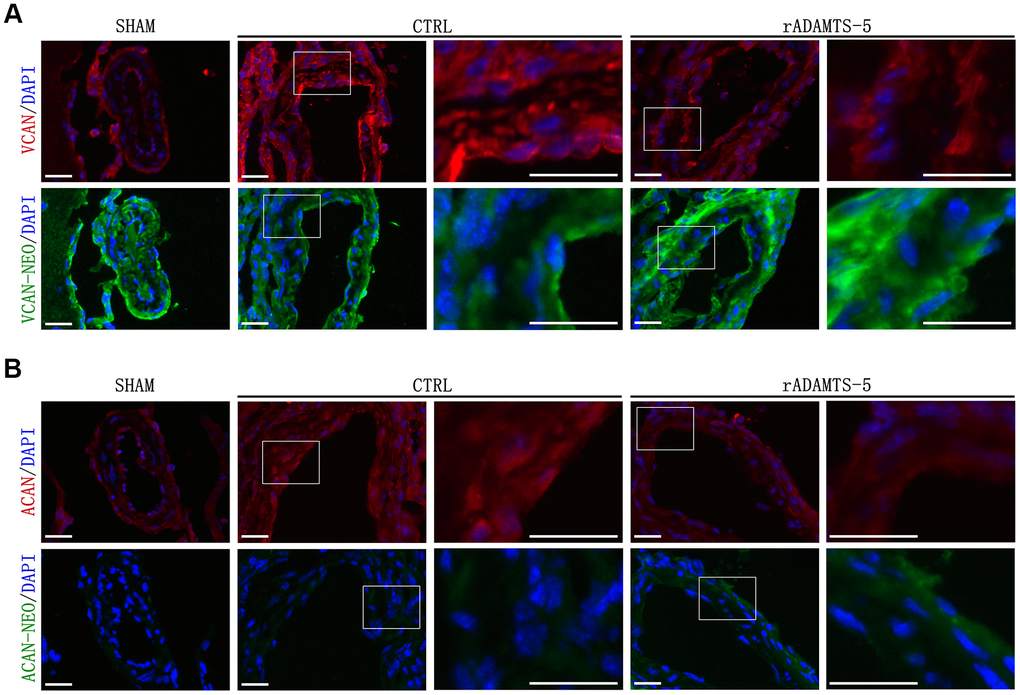 For both human and mouse tissue samples, cryomicrotome-cut transversal sections (10 μm) were collected on polylysine slides and stored at −80° C before staining. Briefly, mouse and human tissue sections were blocked with 5% normal goat serum containing 0.1% Triton X-100 for 60 min (room temperature). Sections were incubated overnight with the following primary antibodies: collagen IV (Southern Biotech, Birmingham, AL, USA); ADAMTS-5, MOMA-2, versican-neo (the DPEAAE neoepitope of versican, neoepitope on versican generated by ADAMTS cleavage), and aggrecan (Abcam, Cambridge, MA, USA); aggrecan-neo (the NITEGE neoepitope of aggrecan) and versican (Thermo Fisher Scientific, Waltham, MA, USA). The sections were then incubated with the appropriate secondary antibody (Alexa Fluor 488, 594, or 647, and FITC or Cy3, Abcam). The sections were washed and coverslipped with antifade medium containing DAPI (Abcam), and images were digitally captured using an Olympus FluoView 1200 confocal microscope, followed by analysis using Image J (NIH, USA) software.