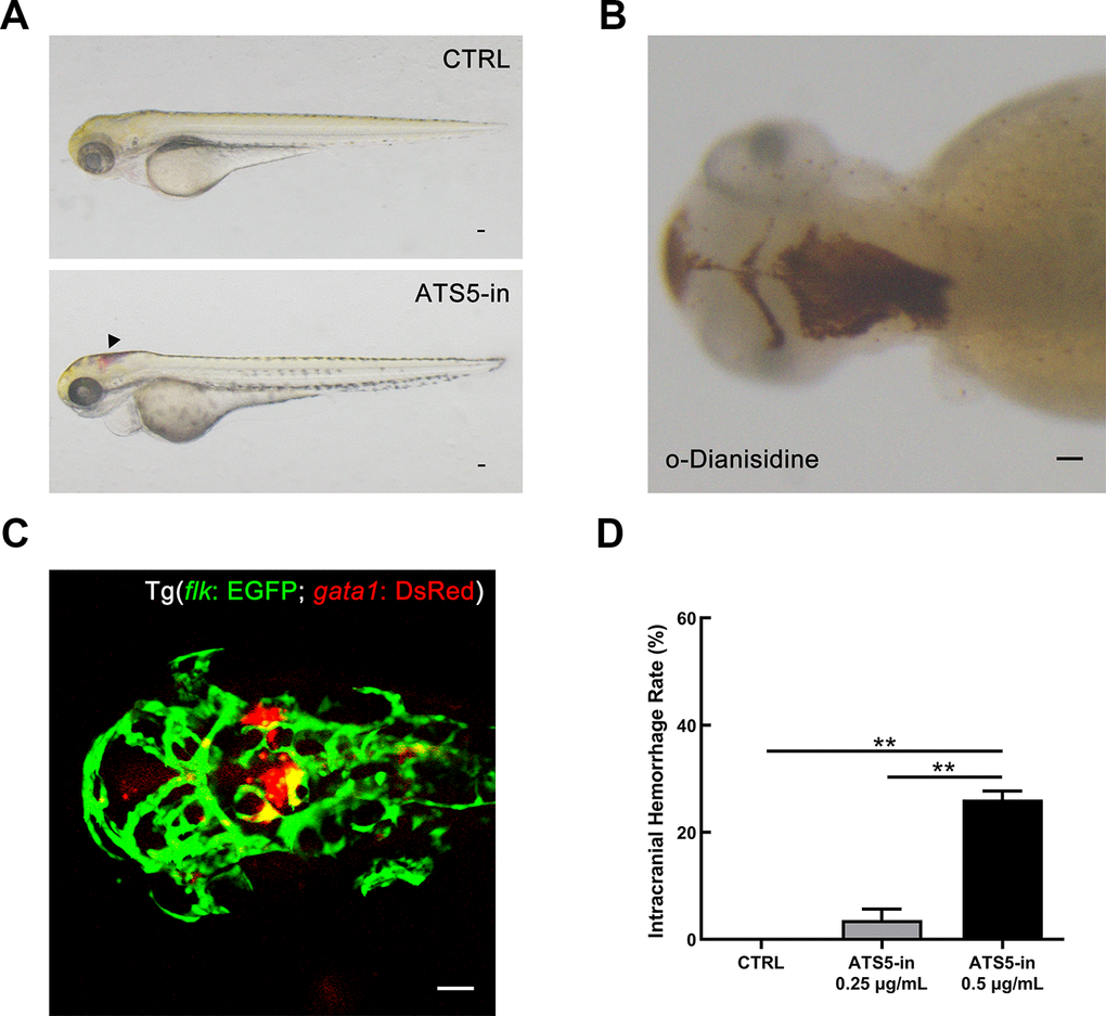 ADAMTS-5 inhibitor (Supplementary Figure 3 in Supplementary Materials) treatment was performed in zebrafish embryos. Compared with the fish embryos of the control group (exposed to 0.1% DMSO, v/v), which exhibit normal development, intracranial hemorrhage was observed in the group treated with ADAMTS-5 inhibitor (ATS5-in 0.5 μg/mL) from 36 hpf to 72 hpf (Figure 7A). O-Dianisidine staining at 72 hpf confirmed the presence of intracranial hemorrhage in those embryos (Figure 7B). We further determined the effect of ADAMTS-5 inhibitor using the Tg (flk: EGFP; gata1: DsRed) transgenic zebrafish line, in which vascular endothelial cells are labeled with EGFP (enhanced green fluorescent protein), and red blood cells are labeled with DsRed (Discosoma sp. red fluorescent protein). The results of confocal microscopy showed that intracranial hemorrhage occurred in the midbrain and hindbrain of the fish embryos (Figure 7C). According to the statistical data, the rate of intracranial hemorrhage was significantly higher in the high-dose ADAMTS-5 inhibitor treatment group than in the low-dose group and DMSO-treatment control group (Figure 7D). The results demonstrated that ADAMTS-5 inhibition may weaken the integrity of the brain blood vessels, leading to intracranial hemorrhage.