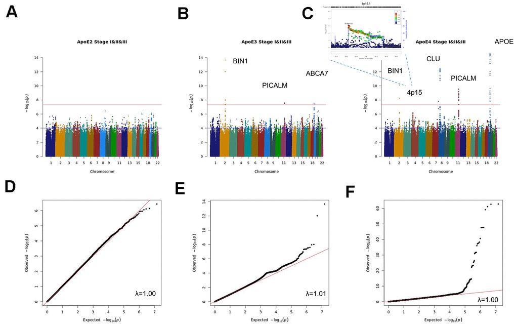 The combined analysis of the three stages (stage I+II+III) (Figure 1 and Supplementary Tables 1–3 and Supplementary Figures 1–3), identified genome-wide significant signals (p<5x10-8) for APOE, BIN1, CLU, CNTNAP2 and PICALM in the APOE4 stratum; suggestive signals (p<10-5) in this analysis include a 1.4Mb intergenic region on 4p15. (from 33.3Mb to 34.7 Mb, hg19) with lowest p value for the SNP rs12641122 (p=6.28x10-7), a 4.5Kb intergenic region on 4q35.2 or the KCNQ3 gene among others. In the APOE3 stratum, ABCA7, BIN1 and PICALM passed the genome-wide significance threshold, with suggestive signals for the HLA-DQ/HLA-DR loci, CTNND2, FBN1, WLS or CSTF1 genes among others. By contrast, no genome wide significant SNPs were found in the APOE2 stratum, nor any known AD gene among suggestive signals.