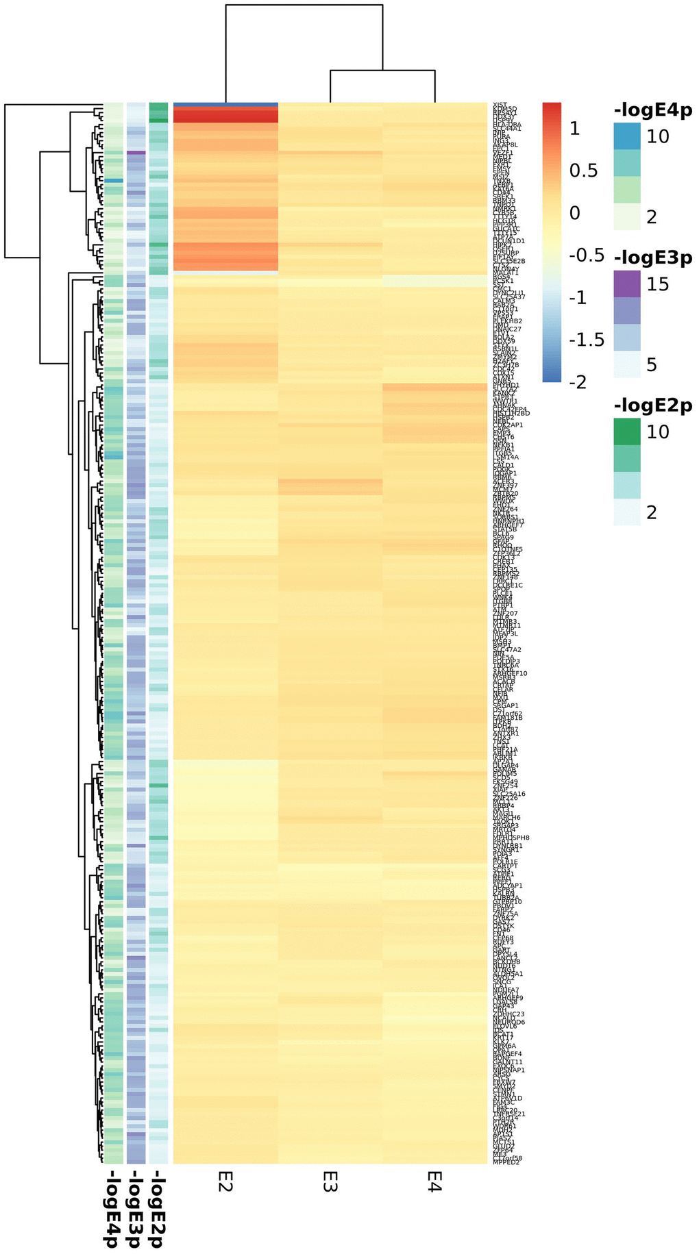 Cortex APOE-stratified DE included the MAYO, ROSMAP, MSBB, GSE15222 and GSE48350 studies. Meta-analysis of cortex datasets resulted in 518, 7714 and 1717 statistically significant genes (FDR<0.05) for the APOE2, APOE3 and APOE4 strata respectively (Supplementary Tables 22–24). As opposed to blood analyses, the overall picture is of enhanced gene expression in AD in all strata, but more pronounced in APOE2 except for XIST, strongly downregulated in AD APOE2 subjects (Figure 3, top 100 genes from each stratum). The heparan sulfate proteoglycan CD44 and the heparan sulfate lysosomal degradation enzyme IDS encoding genes were differentially expressed in all strata, with CD44 strongly upregulated in APOE2 cases and IDS downregulated in APOE4 cases. APOE2 specific genes were mostly nuclear genes involved in primary metabolic processes, as well as some apoptosis related genes (CFLAR, ATM, MCL1, AKT3 and CTSZ), all of them downregulated in AD cases but CTSZ, with higher expression in AD cases than in controls. APOE3 and APOE4 candidate genes were mainly expressed in the cytoplasm. In all strata, we identified genes involved in neuronal development (such as GFAP, BDNF or CDC42), especially in the APOE3 stratum. For both APOE2 and APOE4 strata, genes involved in vesicle mediated transport were identified, with key genes such as PCSK1, SYTL2 or SVOP downregulated in APOE4 cases.