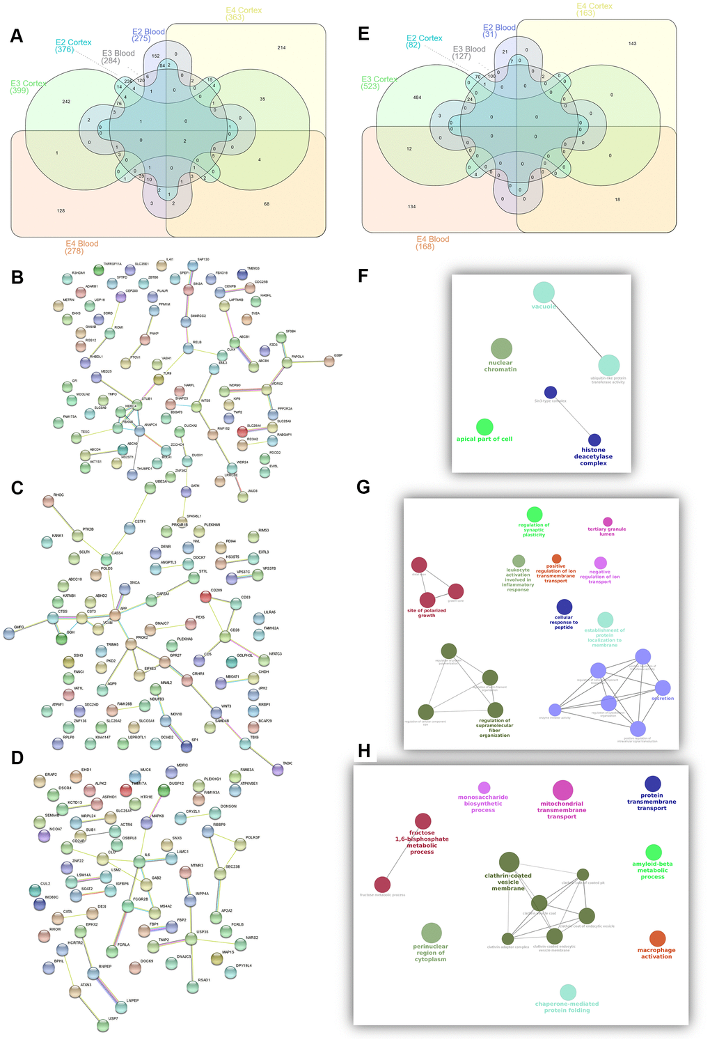 In cortex, we found 376, 399 and 366 significant genes (FDR<0.05) for the APOE2, APOE3 and APOE4 strata respectively. Seven common AD candidate genes (APOC1, APOC2, CD44, CDC42, CLPTM1, DST, PGM2L1) were significant in all three strata; of them, APOC1 and CLPTM1 were also associated in the three strata in blood. In this analysis, the shortest list of APOE-specific genes was found in the APOE4 stratum, which showed the largest overlap with the APOE3 stratum; among the 45 significant genes shared by these strata, we identified several AD genes, including BIN1, MS4A4A, MS4A6A, PICALM and RIN3 in accordance with blood results. The CR1 gene is included among the 19 top genes from the APOE2 and APOE3 strata (ATPIF1, CACNB2, CDC27, CFLAR, COX15, CR1, DCLK1, GOSR2, KANSL1, KLF12, MAPT, MCL1, NSF, POGK, RUFY3, SCD5, SORBS1, SPEN, TTN), whereas APOE, TOMM40, SLC24A4 or WWOX were included among common genes for the APOE2 and APOE4 strata (21 genes: AHNAK, APOE, ARNT, CRTAP, FBXL16, GART, KALRN, KAT6A, MTMR11, OPA1, PDLIM5, PPFIA1, PURA, RBMS2, SLC24A4, SRGAP1, TOMM40, TSPAN14, UBE2F, WWOX, ZNF264). Enrichment analysis also identified both common and exclusive pathways. Common pathways for AD irrespective of the APOE haplotype were related to adhesion, neuronal development, differentiation, and lipoprotein metabolism; diverse signals related to neuronal death are also present in all three strata. Again, we observed larger overlap between APOE3 and APOE4 pathways (glial cell differentiation and activation, immunological, lipid metabolism, cardiovascular system development and heart function) than for APOE2 and APOE3 (which includes axonogenesis) or APOE2 and APOE4 (mainly phospholipid and lipoprotein metabolism due to APOE, APOC1 and APOC2 genes). (Supplementary Tables 34–36 and Supplementary Figure 9). We observed that APOE2 exclusive pathways include chromatin regulation and telomere maintenance related processes. The APOE3 strata showed the largest number of significant enrichments, but most of them showed a similar annotation in APOE2, or, more frequently, in APOE4 strata, with the exception of antigen processing and presentation, IFNG signalling, astrocyte development and activation and myelin sheath. In APOE4 macrophage activation, fructose metabolism, vitamin D mediated inflammation, inositol phosphate metabolism and cholesterol efflux were the most relevant pathways. Clathrin vesicles, amyloid biology, inflammatory and immune response and glial cell development and differentiation appear as the most relevant categories shared by APOE3 and APOE4 strata.