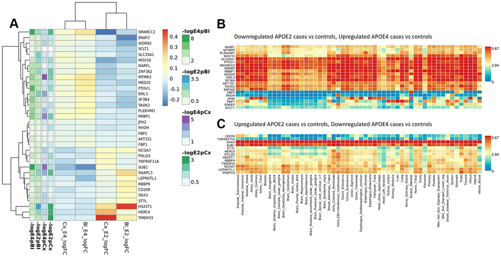 To identify relevant candidate blood biomarkers tracking brain changes in AD pathology we compared blood and cortex analyses (Figure 4). We identified 68 genes in common for the APOE4 stratum, including CLU, CD2AP, IL6, MS4A2, SLC25A1 or INNPP4A (Figure 4C). In APOE3, 76 common genes were found, including APP, AQP9, ATPAF, CD209, LILRA5, NDUFB3 or PTK2B (Figure 4D). Finally, in the APOE2 stratum, we identified 84 common genes including several ABC receptors (ABCA9, ABCB1, ABCB4, ABCD4), solute carrier molecules (SLC25A3, SLC25A4, SLC35E1, SLC9A9), TLR9 or IL4I1 (Figure 4B). Overlap between APOE strata-specific pathways from blood and cortex showed 6 common pathways for APOE2 (Figure 4F), half of them related to chromatin regulation, 24 common pathways for APOE3 (secretion, regulation of supramolecular fiber organization, site of polarized growth and leukocyte activation involved in inflammatory response, Figure 4G) and 18 shared pathways for APOE4, including clathrin coated vesicles, amyloid-beta processing, mitochondrial transmembrane transport, macrophage activation and monosaccharides and fructose metabolism (Figure 4H). We followed up genes with concordant profiles in both blood and cortex (upregulated or downregulated in AD cases vs controls) and showing opposite profiles in APOE2 and APOE4, which included 34 genes with overrepresentation of the gluconeogenesis and fructose metabolic pathways (FBP1, FBP2, SLC25A1) (Figure 5A). When compared with average expression in normal brains, FBP1, FBP2, RHOH, JPH2, ERAp2 and SCLT1 were upregulated in APOE4 cases when they are usually expressed at low levels, whereas, SNX3 and SUB1, were downregulated in APOE4 cases when they are expressed at very high levels in the normal brain according to GTEx (Figure 5B).