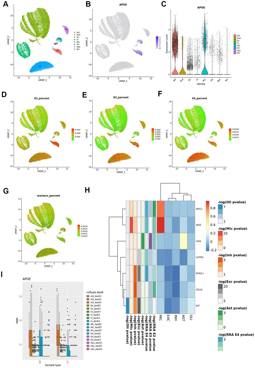 APOE gene was mainly expressed in astrocytes and microglia (Figure 6). According to previous results, APOE is upregulated in microglia from AD subjects when compared with controls (overall and stratified by APOE genotypes). By contrast, in astrocytes we found higher APOE expression levels in cases than controls in the APOE3 stratum (logFC=0.34, p=1.56x10-4), but significant lower expression in APOE4 cases than in controls (logFC=-0.14, p=1.83x10-2, pinteraction<10-5).