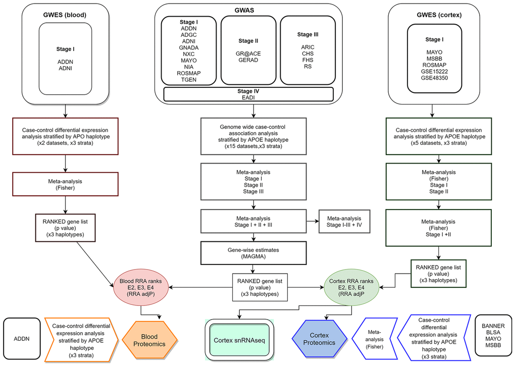 Integrative analysis was performed independently to include either blood or cortex APOE-stratified DE rankings. Thus, we combined meta-GWAS stage I-III gene-level results with blood meta-GWES results (Supplementary Tables 25–27) or with cortex meta-GWES results respectively (Supplementary Tables 28–30).