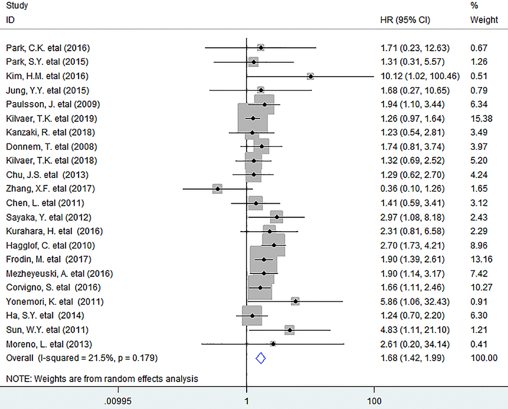 In this study, we noted that increased number of tumor-infiltrating PDGFR-β+ fibroblasts remarkably reduced OS (HR = 1.68, 95% CI 1.42 to 1.99, P < 0.001) in human solid tumors, with little heterogeneity being detected among included researches (I2 = 21.5%, P = 0.179) (Figure 1).