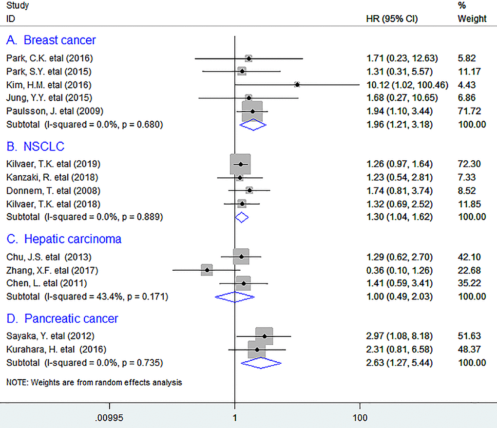 In subgroup analyses based on tumor types, the pooled data indicated that high density of PDGFR-β+ fibroblasts within tumor was markedly associated with reduced OS in breast cancer (BC) (HR = 1.96, 95% CI 1.21 to 3.18, P = 0.006), with no heterogeneity being observed; Similar results were observed between PDGFR-β+ fibroblasts and OS in non-small cell lung cancer (NSCLC) (HR = 1.30, 95% CI 1.04 to 1.62, P = 0.021), and pancreatic cancer (PC) (HR = 2.63, 95% CI 1.27 to 5.44, P = 0.009).(Figure 2) However, we were unable to obtain a combined result for several types of tumor including ovarian cancer, renal cell carcinoma, colorectal cancer (CRC), esophageal squamous cell carcinoma, angiosarcoma and thyroid papillary carcinoma as there was only one study that supplied sufficient data for such type of tumor.