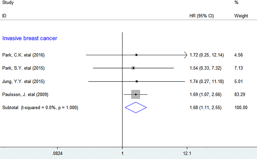 In subgroup analyses, we discovered that increased number of intratumoral PDGFR-β+ fibroblasts was considerably associated with lower DFS in BC (HR = 1.68, 95% CI 1.11 to 2.55, P = 0.014), with little heterogeneity being detected (I2 = 0%, P = 1.000). (Figure 4) However, there was no sufficient data for other types of tumor, so we were unable to obtain the combined result.