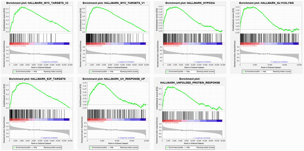 The mRNA expression data was downloaded from the genomic data commons data portal (https://portal.gdc.cancer.gov/). The clinical features and prognostic information of the samples were downloaded from the TARGET database (https://ocg.cancer.gov/programs/target). Hallmark gene sets were downloaded from the Molecular Signatures Database (MSigDB). GSEA was performed to analyze specific gene sets among the hallmark gene sets, which differed significantly between metastatic and non-metastatic OS patients. Seven gene sets, namely, UV response, MYC targets V1, MYC targets V2, hypoxia, E2F targets, glycolysis, and unfolded protein response, were significantly enriched (P < 0.05) (Figure 1 and Table 1). As glycolysis has been clearly shown to be related to metastasis [19], and glycolysis in OS is poorly researched, we chose the glycolysis gene set (P = 0.035), which contained 198 genes, to further analyze how the function of glycolysis-related genes differs between patients with metastatic and non-metastatic OS.