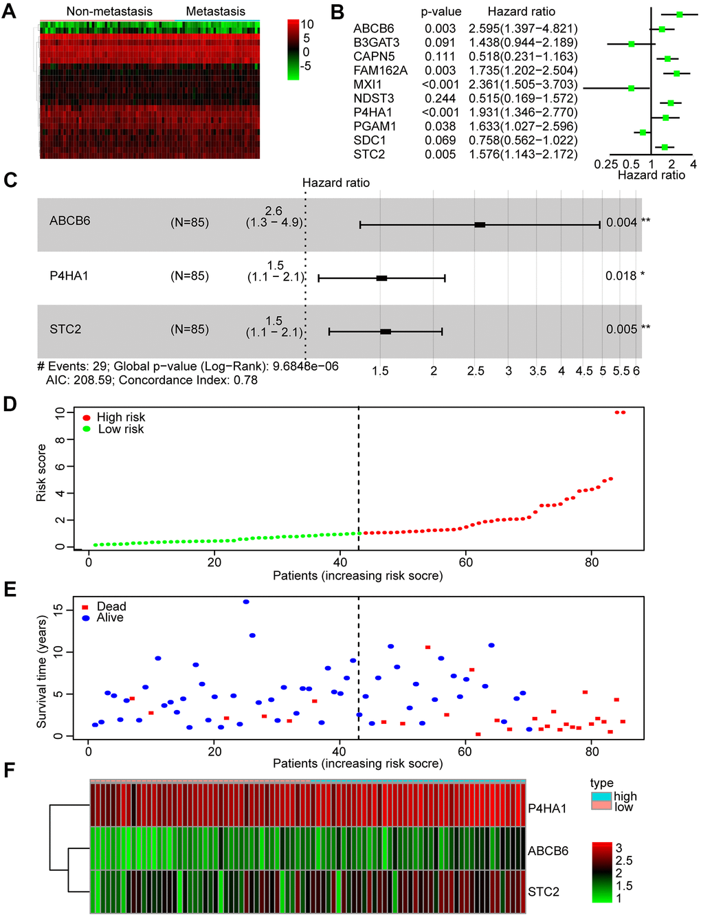 Tumor metastasis is the major cause of mortality in OS patients. An increasing number of researchers have been exploring the underlying mechanisms of OS metastasis [24]. Liu et al. identified metastasis-related genes as potential biomarkers of OS via the bioinformatic analysis of the GEO database [25]. Su et al. also reported the metastasis-associated gene MAPK15 through the GEO database that could promote OS metastasis [26]. Here, we first found that the glycolysis-related gene set was enriched in the metastasis group of OS patients using the TARGET database. Thereafter, we selected glycolysis-related differentially expressed genes in metastasis and non-metastasis samples and further constructed a glycolysis-related risk signature to predict the survival and metastasis of OS patients through univariate and multivariate Cox regression analyses. Three genes were ensured in this risk signature (P4HA1, STC2, and ABCB6). P4HA1 encodes the active catalytic component of prolyl 4-hydroxylase.was one of the genes encoding the active catalytic component of prolyl 4-hydroxylase. Aberrant P4HA1 expression affects tumor progression in several malignant tumors [27, 28]. In pancreatic cancer, P4HA1 can promote glycolytic and malignant phenotypes through the P4HA1/HIF1α feedback loop [29] and in ovarian cancer, P4HA1 promotes tumor metastasis by regulating the epithelial-mesenchymal transition (EMT) [30]. Likewise, we verified the expression of P4HA1 in OS cell lines and found that P4HA1 showed higher expression levels in OS cells than in hFOB1.19 osteoblasts. In the wound-healing migration assay and transwell invasion assays, we found that the knock-down of P4HA1 restrained the metastasis of OS cell lines. Our results demonstrate that P4HA1 is associated with poor prognosis and can promote metastasis of OS in vitro and in vivo. ABCB6, an ATP-binding cassette (ABC) transporter group member, is one of the hallmark genes in glycolysis. There are many biological effects of ABCB6, such as protection against oxidative stress [31], acquired resistance [32, 33], and the potential promotion of tumor proliferation [34, 35]. Consistently, our results showed that ABCB6 was overexpressed in patients with metastatic OS and a high expression of ABCB6 indicated a low survival rate in OS patients. STC2, a human ortholog of fish stanniocalcin, is widely expressed in many tissues. STC2 shows significant upregulation in pancreatic cancer tissues and contributes to metastasis by promoting EMT in pancreatic cancer [36]. In head and neck squamous cell carcinoma, STC2 is regulated by microRNA-206 and influences cell proliferation and invasion [37]. In our study, we showed that STC2 also contributed to the progression of OS and was associated with poor prognosis of OS patients.